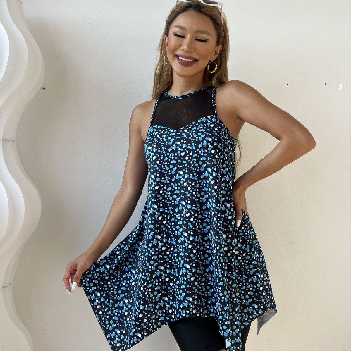 Designed for active beach days or relaxed poolside lounging, this swimsuit offers both flexibility and flair, making it perfect for those who want to stay chic without compromising on coverage. Mesh Printed Conservative Boxer Two-piece Swimsuit.